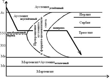 6. Если охлаждение после нагрева производится на воздухе, то такая операция термической обработки носит название нормализации. Нормализация – более экономичная термическая операция, чем отжиг, т.к. меньше времени затрачивается на охлаждение стали. При нормализации уменьшаются внутренние напряжения, эвтектоид приобретает более тонкое строение, в заэвтектоидных сталях устраняется грубая цементитная сетка. Благодаря полной фазовой перекристаллизации при нормализации устраняется крупнозернистая структура, полученная при литье, прокатке или ковке. Прочность и твердость нормализованной стали на 15 - 20 % выше соответствующих характеристик отожженной стали. Отжиг и нормализация – применяются для устранения дефектов предыдущих технологических операций (ковки, литья) и в подготовке структуры с целью улучшения обрабатываемости резанием, улучшения штампуемости в холодном состоянии, а также в подготовке структуры к последующим процессам окончательной термической обработки (если детали или инструменты после обработки резанием термически упрочняются). 7. Изотермический отжиг применяют для гарантированного получения требуемой структурыулучшения обрабатываемости легированных сталей. Состоит он из нагрева на 30-50°С выше АС3, охлаждении ниже Аr1 (сталь охлаждается при переносе в другую печь, в которой поддерживается температура минимальной устойчивости переохлажденного аустенита), изотермической выдержке при этой температуре для получения равновесной перлитной структуры и последующем охлаждении на воздухе. Такой изотермический отжиг более стабилен, т.к. температуру на заданном уровне легче поддерживать, чем регулировать скорость охлаждения.