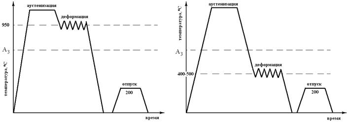 При последующем отпуске до 200°С происходит выделение углерода из мартенсита в виде дисперсных карбидов. В результате ТМО достигается высокая прочность при достаточной пластичности и вязкости. В зависимости от температуры, при которой деформируется аустенит, различают: - ВТМО – высокотемпературную термомеханическую обработку; - НТМО - низкотемпературную термомеханическую обработку.