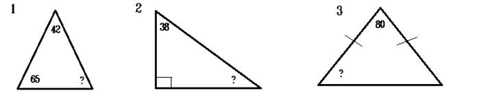 У кожного із вас є завдання на карточках: жовті, зелені, червоні. Розв’яжіть завдання зі своєї картки, а правильність виконання ви зможете перевірити за допомогою листів у конверті. У конверті є три відповіді. Розмістіть їх за номерами завдань. На звороті ви отримаєте три слова із народної мудрості. Максимальна кількість «+» три при виконані всіх завдань. Якщо ви не знайшли числа, то завдання розв’язано неправильно. Картка ЖОВТОГО кольору (завдання початкового та середнього рівня) Чому дорівнює невідомий кут на малюнках?