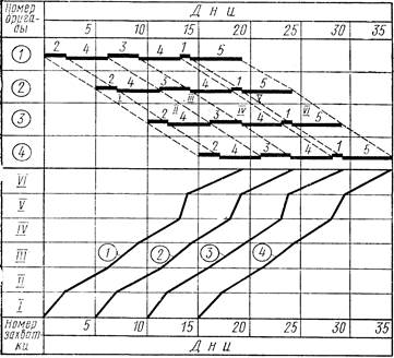 При организации потока с кратным ритмом соблюдаются следующие условия: ритм потока равняется наименьшему из ритмов бригад потока; величина tбр для всех бригад равна tш; количество бригад, выполняемых один и тот же процесс, равно значению кратности ритма этой бригады ритму потока. Неритмичный поток с однородным изменением ритма Для неритмичного потока с однородным изменением ритма необходимо определить такие сроки начала работы бригад потока, чтобы на одной и той же захватке одновременно не работали две разные бригады, что является основным условием потока, и одновременно не было бы необоснованного разрыва во времени между началом работы последующих бригад на одной и той же захватке.