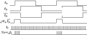 Рисунок 13. Измерение сдвига фаз Измерение частот ниже 100Гц заменяется измерением периода Т х. При этом производится подсчет импульсов фиксированной частоты f0 за интервал равный или кратный измеряемому периоду рис.12. Таким же образом измеряется длительность импульса t х, отличие состоит лишь в том, что при измерении длительности импульса ненужно делить частоту на два. При измерении сдвига фаз временной интервал tj формируют путем конъюнкции сигналов f1 x и f2 x рис.13, полученный интервал времени измеряют методом описанным выше. Схемы, реализующие такой алгоритм, приведены на рисунке 14.