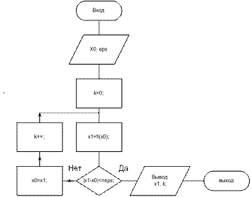 Рис. 1.1. Схема алгоритма метода простой итерации представлена на рис. 1.1. В данном алгоритме число проделанных итераций подсчитывает параметр к, а правая часть выражения 1..4 обозначено как «fi». Точность решения – eps. Число итераций лучше ограничить.