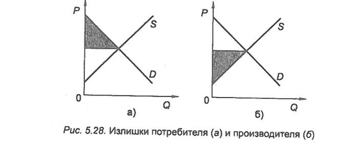 23 Изменения спроса и предложения и их влияние на цену. Выигрыш от обмена: излишки потребителя и производителя. Итак, в стандартном случае рост спроса приводит к росту цен и объемов продаж; снижение спроса — к снижению цен и объемов продаж; рост предложения — к росту объемов продаж и снижению цен; уменьшение предложения — к снижению объема продаж и росту цен. Количественные изменения объемов продаж и цен зависят от параметров функций спроса и предложения. При одновременном сдвиге кривых спроса и предложения (в одном или разных направлениях, на одну или разные величины) возможны различные изменения равновесных цен и объемов производства. Допустим, что в связи с ростом цен на ресурсы, используемые в производстве товара, издержки фирм увеличились и кривая предложения сдвинулась влево—вверх В результате на рынке станет меньше товара (равновесный объем производства сократится до Q2), покупатели начнут активнее конкурировать между собой за покупку данного товара и равновесная цена товара возрастет до Р2. ВЫИГРЫШ ОТ ОБМЕНА: ИЗЛИШКИ ПОТРЕБИТЕЛЯ И ПРОИЗВОДИТЕЛЯ. Излишек потребителя можно интерпретировать и по-другому. Если представить не рыночный, а индивидуальный спрос, то нисходящая форма кривой спроса будет объясняться, в том числе законом убывающей предельной полезности, когда каждая следующая единица товара приносит потребителю все меньшую пользу, и все меньшую цену он готов за нее платить. По аналогии с излишком потребителя можно рассмотреть и излишек производителя При равновесном объеме продаж сумма излишков потребителей и производителей достигает минимума. Понятия излишка потребителя и излишка производителя широко используются при анализе рыночных процессов, затрат и выгод субъектов рынка от тех или иных мер государственного регулирования, изменений рыночной ситуации и т.д. Если функции спроса и предложения представить как непрерывные, то излишки потребителей и производителей можно решать алгебраическим путем, определив площади соответствующих фигур. Для прямых линий спроса и предложения это площади треугольников, их можно рассчитывать по соответствующим правилам; для нелинейных функций спроса и предложения площади фигур рассчитываются как интегралы функций на соответствующем отрезке.