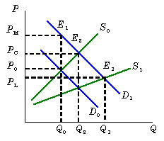 27. Степень изменения объема предложения в ответ на увеличение цены характеризует эластичность предложения. Под эластичностью предложения по цене понимается степень чувствительности изменения предложения товара в зависимости от изменения его цены, показывающая, на сколько процентов увеличится (уменьшится) предложение при изменении цены на один процент. Мерой этого изменения является коэффициент эластичности предложения (ES): До сих пор процесс установления рыночного равновесия рассматривался без учета фактора времени. Однако, какова будет новая равновесная цена в случае нарушения исходного равновесия, зависит не только от расстояния сдвига кривых спроса и предложения и их наклона, но и от прошедшего после его нарушения Пусть первоначальное равновесие на рынке цветов представляет точка Е 0 на рис. 4.11. Если, например вследствие увеличения доходов покупателей спрос на цветы возрастет так, что линия спроса D 0 займет положение D 1, то в мгновенном периоде (в первый день) цена увеличится до PM. На рынке возникнет дефицит, цена спроса окажется выше цены предложения. Образовавшаяся в результате этого прибыль стимулирует рост предложения. Но в коротком периоде (последующие несколько месяцев, пока не будут увеличены производственные мощности в цветоводстве) увеличение предложения сопровождается ростом предельных затрат, так как существующие производственные мощности будут эксплуатироваться с повышенной интенсивностью. Вследствие повышения предложения равновесная цена в коротком периоде PC будет ниже PM, но из-за возросших предельных затрат она окажется выше исходной цены P 0. В длинном периоде цветоводы повысят объем используемого капитала для достижения оптимальной капиталовооруженности труда при возросшем выпуске. Вследствие этого средние и предельные затраты выращивания цветов снизятся и кривая предложения станет положе (сдвиг S 0