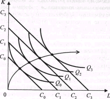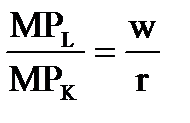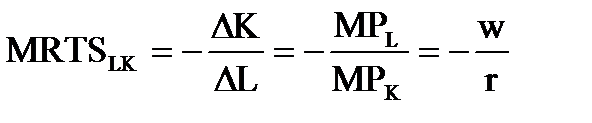 В точке Т производитель находит оптимальное сочетание труда и капитала. Учитывая, что в точке Т изокванта и изокоста имеют одинаковый наклон и что наклон изокванты измеряется предельной нормой технического замещения, можно записать условие равновесия как