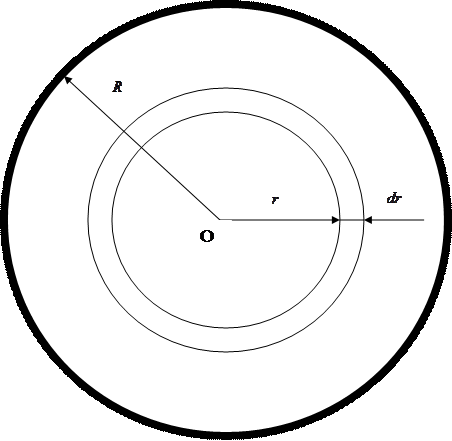 Рисунок 6.4 – Течение слоя жидкости в круглой трубе действуют силы давления, сумма которых составляет значение 3. На боковую поверхность воображаемого цилиндра действует сила трения, равная Условием стационарности в рассматриваемой ситуации является следующее условие: