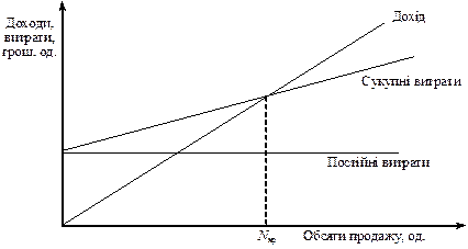 Рисунок 3.5.2 - Графік беззбитковості При цьому за конкретної величини постійних витрат і збільшення обсягу виробництва продукції до певного рівня її виробництво є збитковим (