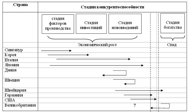 М. Портер теоретически обосновал и проверил на практике положение о том, что каждая страна находится на одной из перечисленных на рис. 4 стадий конкурентоспособности экономики. Таким образом, благосостояние — это цель общества, факторы производства и инвестиции — средства, а нововведения (инновации) — метод достижения цели.
