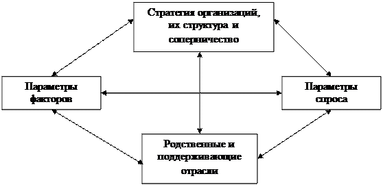 При прогнозировании динамики " конкурентоспособности страны" следует анализировать структуру (пропорцию) экстенсивных и интенсивных факторов развития страны. К экстенсивным факторам относятся факторы производства и инвестиции, к интенсивным — инновации. Поэтому для неуклонного повышения конкурентоспособности страны следует обеспечивать увеличение удельного веса интенсивных факторов развития экономики, т.е. постоянно повышать активность и эффективность инновационной деятельности. Структура факторов производства и инвестиций должна постоянно улучшаться в пользу инноваций (нововведений). Чем больше в ВВП удельного веса наукоемкой продукции, высоких технологий, тем выше конкурентоспособность страны. В связи с этим вспоминаются целевые комплексные программы (ЦКП) " Интенсификация", разрабатываемые в 80-е годы до 1990, 1995 гг. для разных уровней управления. Многие идеи, научно-технические и опытно-конструкторские разработки, выполненные в те годы, остаются невостребованными и поныне. В предложенной модели М.Портер вводит четыре основополагающих понятия, на основе анализа которых он предлагает оценивать конкурентные преимущества отраслей, закономерности их возникновения, развития и упадка.