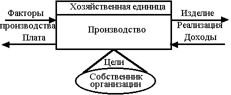 С точки зрения права, организация — самостоятельный хозяйствующий (ведущий ту или иную деятельность с целью реализации ее результатов на рынке) субъект, созданный в порядке, установленном Гражданским кодексом РФ, для производства продукции, выполнения работ и оказания услуг в целях удовлетворения общественных потребностей и получения прибыли. С точки зрения экономики, организация представляет собой (рис. 1): – хозяйственную единицу; – в которой планомерно и целенаправленно комбинируются факторы производства; – чтобы посредством изготовления и реализации изделий (работ, услуг); – обеспечить достижение целей этой хозяйственной единицы и ее собственника.