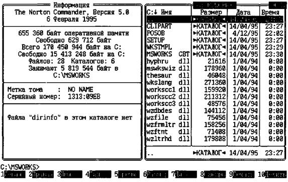 Взаимодействие пользователя с DOS в среде пакета Norton Commander осуществляется в диалоговом режиме. Информация выводится на экран дисплея в так называемые окна. Окно — это ограниченная прямоугольной рамкой и выделенная отличительным цветом часть экрана, которая позволяет либо просматривать выведенную в нее информацию одновременно с информацией в другой части экрана, либо осуществлять выбор из предложенных альтернативных пунктов, либо вводить или изменять информацию в отдельных ее зонах. Пакет программ Norton Commander выводит информацию в окна двух типов: информационные и диалоговые. Большая часть окон является окнами диалогового типа и предназначена для выбора тех или иных действий или режимов работы. Окна, в которых предлагается сделать выбор из нескольких возможных вариантов действий, называются меню. Информационное окно — это окно, которое, как правило, занимает всю площадь экрана и предназначено главным образом для получения информации о различных компонентах вычислительной системы. Информационное окно может делиться вертикалью пополам на две панели (рис. 10.1). Панели могут иметь различный вид и содержать разнообразную информацию о файлах, каталогах и дисках. В неразделенное информационное окно возможен вывод: • дерева каталогов диска; • краткой информации о компьютере; • плана загрузки оперативной памяти; • параметров конфигурации (настройки) пакета. На рис. 10.1 изображено информационное окно, разделенное на две панели. На левую панель выведена информация о диске и каталоге правой панели. На правую панель выведен перечень файлов каталога C: \MSWORKS.