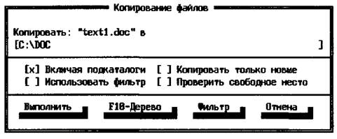 Примечание. Символ ^ перед названием клавиши означает нажатие этой клавиши одновременно с < Ctrl>. Например, запись < ^О> означает одновременное нажатие клавиш < Ctrl> и < О>. Клавиша < Backspace> для краткости обозначена как < BS>. < F5>, < F6>, < F8> — копирование, перемещение, переименование и удаление файлов и каталогов. Операции копирования, перемещения, переименования и удаления могут выполняться как над одним файлом или каталогом, так и над их группой. Дня того чтобы произвести над файлами или каталогами соответствующую операцию, необходимо выполнить следующие условия: • файлы или каталоги должны находиться в активной панели; • строки с именами обрабатываемых файлов (каталогов) должны быть выделены. Если требуется произвести операцию над одним файлом (каталогом), то достаточно только установить на строку с именем этого файла (каталога) селектор панели. Если необходимо выделить группу, то следует последовательно устанавливать селектор на строки каталога с соответствующими именами и нажимать каждый раз клавишу < Insert>. При ошибочном выделении какого-либо файла (каталога) возможна отмена выделения повторным нажатием в соответствующей строке клавиши < Insert>. Существует и другой, более быстрый способ выделения нужных файлов (каталогов) при помощи клавиши < Серый +>, расположенной в зоне малой цифровой клавиатуры. Нажатием клавиши < Серый +> вызывается окно диалога. В нем требуется указать шаблон, идентифицирующий группу для выделения ее компонентов. В шаблоне можно использовать символы-заменители (* и?). Например, шаблон *.txt идентифицирует группу, состоящую из всех файлов, имена которых содержат расширение.txt. Для отмены выделения группы служит клавиша < Серый ->. Клавиша < Серая *> позволяет инвертировать текущее выделение, т.е. отмечать невыделенные имена и снимать выделение остальных. Для копирования или переноса файлов и каталогов рекомендуется выполнить следующую последовательность действий: • установить в одной панели (исходной) каталог, откуда предстоит копировать (перемещать); • установить в другой панели каталог, куда необходимо копировать (перемещать); • выделить в исходной панели файлы или каталоги, подлежащие копированию (перемещению); • сохраняя исходную панель как активную, нажать клавиши: < F5> — для копирования, < F6> — для перемещения. При копировании появляется вспомогательное диалоговое окно, примерный вид которого показан на рис.10.9. Если копируется один файл, то в верхней части окна будут отображены имя копируемого файла и путь к каталогу, в который должно произойти копирование. Если копируется группа файлов, то указывается только количество копируемых файлов. Если вы хотите скопировать каталог со всеми входящими в него файлами и подкаталогами, то необходимо установить флажок. Включая подкаталоги и, выбрав кнопку < Выполнить>, нажать клавишу < Enter>.