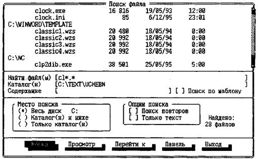 Поиск файлов. Пункт меню Поиск Файлов или комбинация клавиш < Alt> и < F7> обеспечивают вызов диалогового окна (рис. 10.19), в соответствующие поля которого пользователь должен ввести запрос, указав имя или шаблон имени искомого файла, а при желании фрагмент текста, содержащегося в файле. После ввода шаблона имени нужно нажать клавишу < Enter>. Курсор укажет на вторую строку ввода, в которую можно занести текст, а затем нажать кнопку < Старт> диалогового окна.