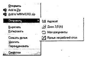выполнить действия, возможные для этого объекта, выбором из этого меню соответствующих команд. Следует отметить, что объекты, относящиеся к одному классу, могут выполнять одни и те же действия. Например, если объектом является документ, то независимо от программной среды, где он создавался, его можно вырезать, копировать, удалять, переименовывать и осуществлять прочие указанные на рис. 12.1 действия. Некоторые действия, перечисленные в контекстном меню, можно выполнить по другой технологии: с помощью мыши переместить значок объекта на другой значок, который отображает программу или устройство, способное выполнить необходимое действие. Например, перетащив мышью значок файла с текстовым документом на значок принтера, можно осуществить автоматическую печать текста. Объектно-ориентированная технология Windows предоставляет возможность пользователю создавать документы, фрагменты которых подготовлены в разных средах. Например, в текстовом редакторе формируется текст, куда включаются рисунки, созданные в графическом редакторе, а также таблицы, подготовленные в табличном процессоре. Знакомство с объектами Windows начнем с описания его базовых объектов — файлов, папок, приложений, документов. Остальные объекты, каждый из которых играет свою уникальную роль при работе в данной среде, будут описаны в следующих подразделах.