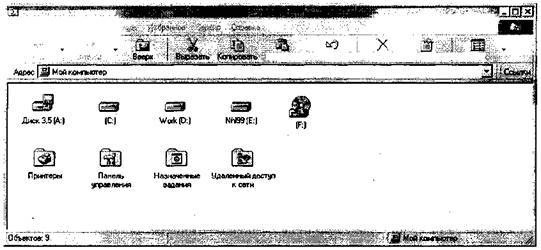 Рис. 12.21. Окно Проводника без схемы подчиненности папок В верхней части любого окна Проводника находятся Управляющее меню и панели инструментов: • панель с кнопками, предназначенными для быстрого выполнения наиболее употребляемых команд; • адресная строка, в которой указывается имя активной (текущей) папки или адреса Интернет; • кнопка < Ссылки>, упрощающая доступ к Web-страницам при работе в сети Интернет.