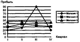 На приведенных диаграммах рассматриваются данные табл. 14.1, представленные в различных графических форматах. Круговая диаграмма (рис. 14.4) используется для графической интерпретации одной переменной — поквартального распределения прибыли одним из магазинов. Значения этой переменной представляются в диаграмме секторами круга. Этот тип диаграмм обычно используется для сравнения отдельных значений переменной между собой и с общей их суммой. Диаграммы, приведенные на рис. 14.4 — 14.7, предназначены для интерпретации нескольких переменных (поквартального распределения прибыли трех магазинов). Вертикальная столбцовая диаграмма изображает каждое значение переменной как вертикальный столбик. Используется для сравнения значений переменных в различные моменты времени.
