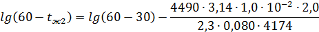 В качестве второго приближения задаемся tж2 = 45 °С. Тогда tж2 =35 °С; μ ж = 7, 28∙ 10 -4 Па∙ с; λ ж = 0, 626 Вт/(м∙ K); Рrж =4, 85; Rеж = 12100; Nuж = 86 и α = 4490 Вт/(м2∙ K).