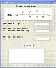 Фрагмент кода: {***********************************************************} procedureTfrm_Z3.btnOKClick(Sender: TObject); var sum, x, eps, a, mnog: extended; i, m_dop: Word; begin // Присвоение значенийx, eps, m_dop i: = 0; {количество членов ряда} a: = x; { a - первый член ряда } Sum: = a; { Sum - первая частичная сумма ряда } while (abs(a) > eps) and (i< =m_dop) do begin mnog: = -x*x/(2*i+2)/(2*i+3); a: = a*mnog; Sum: = Sum+a; i: = i+1; end;