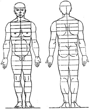 Метод Долініна. Використовують у спеціалізованих шпиталях і відділеннях із надання допомоги обпеченим. На аркуш паперу нанесені контури тіла людини (вигляд спереду і ззаду), які поділені на сегменти (рис 9.14). Кожен сегмент відповідає 1 % від загальної площі поверхні тіла людини. Заштриховуючи відповідні сегменти, які відповідають локалізації і глибині опіків, можна визначити загальну площу глибоких опіків (рис. 9.15). Ці аркуші вкладають в карту хвороби потерпілого.
