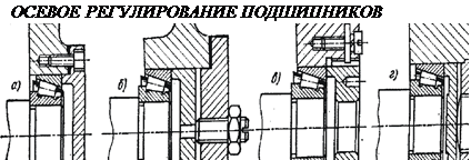 Жёсткость увеличивается предварительным натягом, суть которого в выборке зазоров и начальном сжатии тел качения. Это достигается взаимным осевым смещением колец посредством: è затяжки резьбы (а); è пружинами (б); è установкой втулок (в); è шлифовкой торцов колец (г). Излишний преднатяг приводит к усилению износа сепаратора из-за набегания на него части тел качения и отставания другой части в связи с разными их диаметрами.