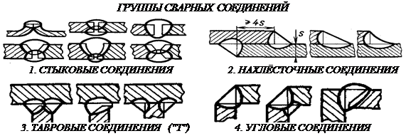 Сварные соединения (швы) по взаимному расположению соединяемых элементов делятся на следующие группы: