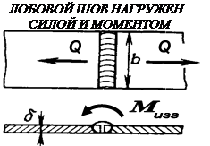 τ Q = Q / [ 0, 707 k (2 lф+ lл )] ≤ [ τ ' ] шва. Если действует момент M, то τ M = M / [ 0, 707 k lл ( lф+ lл /6 )] ≤ [ τ ' ] шва. При совместном действии силы и момента касательные напряжения складываются τ = τ М + τ Q ≤ [ τ ' ] шва.