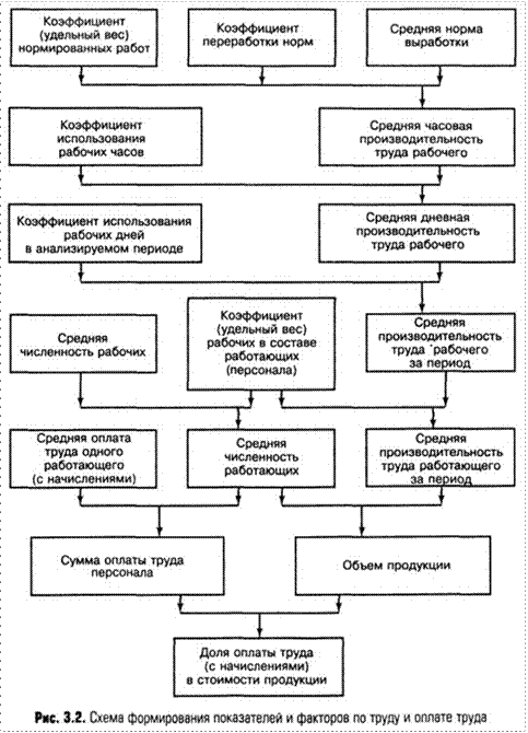 – в области оплаты труда – проверка степени обоснованности применяемых форм и систем оплаты труда; определение размеров и динамики средней заработной платы отдельных категорий и профессий работников; выявление отклонений в численности работников и средней заработной плате на расход фонда заработной платы; изучение эффективности применяемых систем премирования; исследование темпов роста заработной платы, их соотношение с темпами роста производительности труда; выявление и мобилизация резервов повышения эффективности использования фондов заработной платы (в широком смысле слова под оплатой труда понимаются не только расходы на заработную плату и премии персоналу, но и выплаты (отчисления) на социальные нужды и другие затраты, связанные с использованием рабочей силы на предприятии). Схема формирования и анализа показателей по труду и заработной плате была представлена на рис. 3.2.
