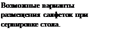 При сервировке стола салфеткам придается наиболее удобная и красивая форма. Хорошо отглаженная салфетка должна иметь как можно меньше загибов, удобно разворачиваться. Каждый официант должен не только владеть в совершенстве технологией складывания салфеток, но и творчески подходить к выбору определенной формы складывания салфетки, в зависимости от статуса мероприятия. Полотняные салфетки кладут на закусочную или десертную тарелки, бумажные салфетки ставят в специальных подставках и вазах. Возможно размещение салфетки на пирожковой тарелке или непосредственно на скатерти между приборами – ножом и вилкой.