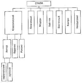 Рис. 2. Стили, используемые при оформлении интерьеров залов Ампир (франц. ampire — империя) — стиль первых трех десятилетий XIX в., завершающий развитие классицизма. Для него характерны парадное великолепие архитектуры и интерьеров, пилястры (плоский вертикальный выступ на поверхности стены), анфилады (помещения, соединенные дверями, расположенными на одной оси) и залы, украшенные мрамором, бронзой, зеркалами, живописными панно, позолоченной лепкой и резьбой. Мебель (красное дерево, карельская береза, ясень и др.) имеет правильные, симметричные формы, украшена резьбой. Строгость форм мебели подчеркивают резные пальметки (стилизованный веерообразный лист) и другие античные мотивы. Ножки и подлокотники кресел выполнены в виде фигур фантастических животных. В посуде, канделябрах из серебра имеют место спокойные прямые формы с гладкими поверхностями, контрастирующими с гравировкой. Различают два вида стиля ампир: европейский и русский. Европейский — более пышный: много золота, лепнины, колонн, капителей (верхняя часть колонны украшается орнаментами), зеркал, роспись на стенах и потолке, тяжелые драпировки на окнах, мебель антикварная или современная под ампир. Русский ампир — менее пышный, более спокойный, лиричный. Колонны не такие помпезные, их можно только обозначить. Более изящная лепнина на потолках, стенах; хрустальные люстры. Драпировки приглушенных тонов. Много белого или теплого розового цвета. Большие окна и множество зеркал. В интерьере преобладает легкость, комфортность. Возможно наличие в залах каминов, декорированных бронзовыми драконами по углам и лепными скульптурными группами. Узорчатый дубовый паркет застелен ковром, гармонирующим с обивкой стульев с высокими спинками, скатертями и салфетками нежных пастельных тонов. Празднично смотрятся белые накрахмаленные верхние скатерти. Посуда — современная, но по желанию потребителей может быть использована глиняная (под XIX в.). Барокко — основное стилевое направление в декоративном искусстве Европы и Америки конца XVI — середины XVIII вв. Барокко связано с дворянско-церковной культурой зрелого абсолютизма. Ему свойственны контрастность, напряженность, динамичность образов, стремление к величию и пышности, совмещению реальности и иллюзии. Классический стиль в интерьере ресторана «Гранд-Империал» отличается строгостью: длинные драпированные скатерти, тяжелые (двойные); мягкая уютная мебель из ценных пород дерева. Он органично сочетается с элементами ампира: предметы из позолоченной бронзы, зеркала в рамах, вазы в виде греческих амфор. Все эти украшения смягчают строгость классического интерьера (рис. 1 ). Рококо — стилевое направление в европейском искусстве первой половины XVIII в., когда в России наступил кризис власти. Для этого периода характерны изысканность, театрализация, комфорт, уход в мир фантазии и мифических сюжетов. В зале, оформленном в классическом стиле с элементами рококо, можно использовать столы причудливой формы, посуду, декорированную под старинный сервский фарфор, скатерти и салфетки с вышивкой ришелье. Столешница украшается изящными букетами. Готический стиль возник в первой половине XII в. во Франции и Англии и позже распространился по всей Европе. Этот стиль применим для концептуальных ресторанов, стилизованных под готическое подземелье, сре