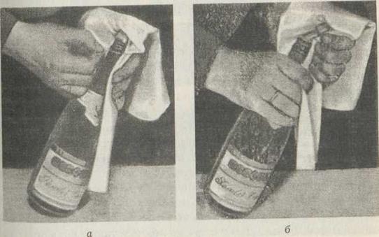 Перед откупориванием бутылку обязательно показывают заказчику. Затем горлышко бутылки накрывают салфеткой (а). Бутылку держат левой рукой за горлышко через салфетку таким образом, чтобы большой палец располагался на пробке, придерживая ее, а правой рукой слегка подтягивают на себя колечко проволочной сетки и раскручивают проволоку против часовой стрелки. Затем, удерживая пробку левой рукой, берут бутылку в правую руку под салфеткой и, держа ее с небольшим наклоном, левой рукой извлекают пробку, поворачивая ее в горлышке бутылки (б).