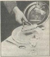 Ø официант предлагает блюдо гостю, который обслуживает себя сам (рис.34). Гость, пользуясь приборами для порционирования, кладет себе в тарелку порцию рыбы, мяса или другого блюда (а). Французский метод используют также при подаче вторых горячих блюд без соуса или блюд, к которым соусы подают отдельно (осетрина фри, стейк из семги, рулет из лососины с лобстером, бифштекс из телячьей вырезки, медальон из говядины, бараньи котлетки с чесночной корочкой Гусарская рулетка). Официант приносит на покрытом салфеткой подносе вторые горячие блюда в мельхиоровой посуде и подогретые мелкие столовые тарелки, ставит поднос на подсобный столик, убирает со стола использованную посуду, ставит перед гостем подогретую мелкую столовую тарелку, придерживая ее ручником. Поверх основного продукта кладут прибор для раскладки ручкой к правой руке официанта так, чтобы рожки прибора выступали за край посуды. Блюдо берут ручником правой рукой, ставят на ладонь левой и на ручник, который должен прикрывать манжет рукава и предохранять ладонь руки от возможного ожога. Официант становится с левой стороны от гостя и, немного наклонив корпус, слегка выдвинув вперед левую ногу и положив правую руку за спину, показывает блюдо гостю, чтобы было видно оформление. При этом основной продукт (мясо, птица или рыба) должен быть обращен к гостю. Затем официант приближает блюдо к тарелке, не касаясь ее и не опираясь кистью руки о стол, и с помощью прибора для раскладки перекладывает сначала основной продукт на тарелку ближе к гостю, потом гарнир, порционируя его частями и распределяя за основным продуктом справа налево (б). Английский метод предусматривает применение приставного столика, серванта или тележки, на которых подготавливают блюда в непосредственной близости от посетителей, например, смешивают компоненты салатов, порционируют холодные блюда, гарнируют вторые блюда. Английским методом подают вторые блюда сложной раскладки (судак орли, осетрина кольбер, шашлыки, котлета по-киевски), соусные блюда (осетрина в рассоле, стерлядь паровая, филе в соусе мадера). Горячие блюда сложной раскладки официант приносит в зал вместе с подогретыми мелкими столовыми тарелками и приборами для порционирования. Блюдо с продуктом устанавливают в левой части приставного стола. Затем ставят тарелки, которые логотипом должны быть повернуты к официанту. Официант подносит блюдо к столу для посетителей и, придерживая его ручником, показывает заказчику с левой стороны. Получив разрешение, официант перекладывает блюдо на приставном столе на тарелки гостей: сначала — основной продукт, потом гарнир. Особенно аккуратно следует перекладывать компоненты сложного гарнира, не допуская их смешивания. Вначале во все тарелки раскладывают один вид гарнира, затем второй и т. д., распределяя его равномерно и создавая красочные сочетания. Если на блюде есть соус, то им поливают основной продукт (в). Работа с приставным столом. Приставной стол накрывают скатертью и располагают около обеденного стола так, чтобы гости могли наблюдать за действиями официанта. Английский метод предусматривает различные способы порционирования блюд: 1.Порционирование салатов с различными заправками. Официант устанавливает в верхней части приставного стола различные ингредиенты для салатов в стеклянной посуде и с