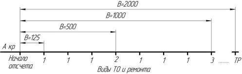 где ВТО-1 – наработка до ТО-1 мото-ч. Определение наработки трактора от последнего вида технического обслуживания можно проводить и по структурной шкале периодичности технического обслуживания (рисунок 10.1)
