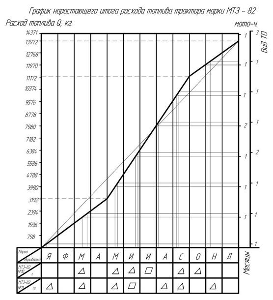 Акр - наработка трактора от последнего капитального ремонта (или начала эксплуатации); В - периодичность проведения данного вида ТО или ремонта, мото-ч. Рисунок 10.1 - Структурная шкала периодичности ТО и ремонта Для определения годового количества ТО и ремонтов воспользуемся так же графическим методом планирования технического обслуживания по кривой нарастающего итога расхода топлива. Для определения вида и срока технического обслуживания на график нарастающего итога расхода топлива наносим шкалы годовой наработки и периодичности технического обслуживания (оси ординат), а под шкалой абсцисс вычерчиваем график технического обслуживания по календарному времени года (рисунок 10.2). Строим окончательную кривую нарастающего итога расхода топлива на планируемый год по каждой марке трактора. Начало кривой соответствует значению расхода топлива на 1 января планируемого года. Начиная с января, в масштабе, последовательно прибавляем расход топлива, запланированный на каждый месяц планируемого года. Для составления плана технического обслуживания тракторов необходимо построить интегральную кривую расхода топливадля каждого трактора. Предварительно необходимо установить периодичность технического обслуживания по количеству израсходованного топлива (кг, литры), при периодичности ТО в моточасах (для тракторов 125 – 500 – 1000 мото-ч). Например, для трактора МТЗ – 82 запишем периодичность ТО 1-1050 кг, ТО 2-4200 кг, ТО 3-8400 кг., что соответствует наработки 125 – 500 – 1000 мото-ч. Далее определим плановый расход топлива каждым трактором по месяцам года, исходя из заданного годового расхода на один трактор и распределения его по месяцам в %. Наработку Qн на 1 января планируемого года берем из бухгалтерских документов (задание на курсовой проект), а плановую годовую наработку и ее распределение по месяцам определяем из годового объема механизированных работ или на основании анализа расхода топлива за предыдущие три года. Общепринятые значения распределения расхода топлива по месяцам в % следующие: Имеется три характерных периода I, II, III. У гусеничных тракторов: I – январь, февраль, март – месячный расход топлива – 6% от годового расхода (итого 18%). II – апрель, май, июнь, июль, август, сентябрь - месячный расход топлива – 11% от годового расхода (итого 66%). III – октябрь, ноябрь, декабрь - 5% от годового расхода (итого 15%). У колесных тракторов: I – январь, февраль, март, апрель – месячный расход топлива – 6% от годового расхода (итого 24%). II – май, июнь, июль, август, сентябрь - месячный расход топлива – 12% от годового расхода (итого 60%). III – октябрь, ноябрь, декабрь – 5, 3 % от годового расхода (итого 16%). У комбайнов: I – июнь, июль, август – равномерно в течении сезона работы (итого 100%). Пример кривой нарастающего итога расхода топлива 2-х тракторов МТЗ-82 с годовым расходом топлива одного трактора 13 972 кг приведен на рисунке 10.2. В графе марка и номер трактора указываем расход топлива на первое января планируемого года. Справа от шкалы расхода топлива наносим шкалу чередования видов ТО и ремонтов. В качестве условных обозначений примем следующие: Δ - ТО1; □ - ТО2; ○ - ТО3; ◊ - текущий ремонт ТР; ⌂ - капитальный ремонт КР.
