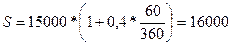 Ссудный процент используется в депозитарных и кредитных операциях. Определение (Гражданский кодекс РФ (далее ГК РФ) п. 1 ст. 819). По кредитному договору банк или иная кредитная организация (кредитор) обязуется предоставить денежные средства (кредит) заемщику в размере и на условиях, предусмотренных договором, а заемщик обязуется возвратить полученную денежную сумму и уплатить проценты на нее. Определение (ГК РФ п. 1 ст. 834). По договору банковского вклада (депозита) одна сторона (банк), принявшая поступившую от другой стороны (вкладчика) или поступившую для нее денежную сумму (вклад), обязуется возвратить сумму вклада и выплатить проценты на нее на условиях и в порядке, предусмотренных договором. Пример 1. Кредит в размере 15000 рублей выдан на 60 дней под 40% годовых. Какую сумму заплатит заемщик в конце срока? Решение: