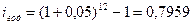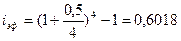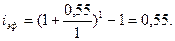 где N –общее количество периодов начисления; j/m – ставка за период, исчисленная на основе базовой (номинальной ставки j), и числа раз начисления процентов в году (m). Если N – целое число (N = m*n), то в большинстве случаев для определения величины множителя наращения можно воспользоваться таблицей сложных процентов (Приложение 2). Например, при j = 20% и поквартальном начислении процентов (m = 4) в течение пяти лет отыскиваем табличное значение множителя для i = 20/4 = 5% и n = 5 * 4 = 20, находим q = 2, 653298. Чем чаще начисляются проценты, тем быстрее идет процесс наращения. Эффективная ставка. Эффективная процентная ставкаизмеряет тот реальный относительный доход, который получают в целом за год от начисления процентов. Эффективная процентная ставка – это годовая процентная ставка, рассчитанная по схеме сложного процента, эквивалентная заданной процентной ставке с учетом периодичности начисления процентов. Иначе говоря, эффективная ставка – это годовая ставка сложных процентов, которая дает тот же результат, что и m-разовое начисление процентов по ставке j/m. Обозначим эффективную ставку через iэф. По определению множители наращения по двум видам ставок (эффективной и номинальной при m-разовом начислении) должны быть равны друг другу: