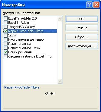 Файл надстройки repairpivottablefilters.xla совместим со всеми версиями Excel. Устанавливается стандартными средствами Excel: Запускает процедуру обновления содержимого фильтров сводной таблицы по нажатию Ctrl+m (Ctrl+ь).