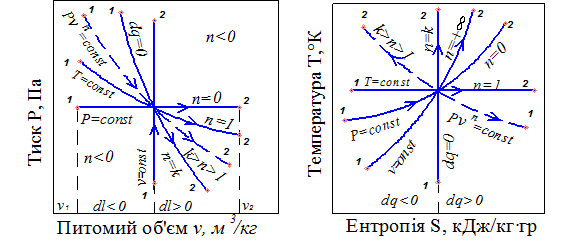 Рис.1. Процеси зміни параметрів ідеального газу в Р– υ та Т– S - координатах