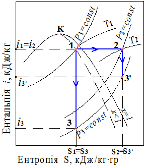 Рис.11. Процес дроселювання пари в І–S - діаграмі 1-2 - процес дроселювання при i1 = i2 = const; 1-3 - адіабатний процес розширення газу до дроселя від тиску p 1 до p3; 2-3′ - адіабатний процес розширення газу після дроселя від тиску p2 до p3; T2 – T1 = Δ T інтегральний дросель-ефект