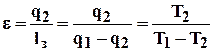 q1 – теплота, яка передається гарячому джерелу теплоти (в навколишнє середовище) при температурі Т1 на 1 кг р.т., кДж/кг; q2 – теплота, що відбирається від холодного джерела теплоти (питома холодопродуктивність) при температурі Т2 на 1 кг р.т., кДж/кг; e – холодильний коефіцієнт – характеристика економічності холодильної машини (ХМ), відношення теплоти, відведеної від холодного тіла, до витраченої при цьому роботи