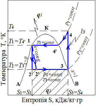 На діаграмі нанесені граничні криві КА (х = 0) та КВ (х = 1), що розділяють площину діаграми на однофазну область рідини (лівіше від кривої КА), двофазну область вологої пари (між лініями АК і ВК) та однофазну область перегрітої пари (правіше кривої КВ). У межах усієї площини діаграми нанесені ізотерми (Т = const) і адіабати (S = const). В області рідини (лівіше від пограничної кривої х =0) ізотерми практично збігаються з вертикальними прямими і = const. В області перегрітої пари ізотерми зі зростанням ентальпії круто падають, а в критичній точці К мають точку перегинання. Кількість теплоти, що підводиться у процесі 2 – 3 до 1 кг робочого тіла (питома холодопродуктивність), визначається за його основними термодина - мічними характеристиками за залежністю