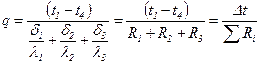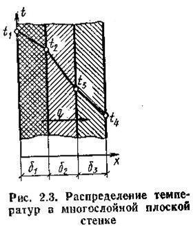 Температурне поле багатошарової стінки зображають ламаною лінією. Тепловий потік, що передається через багатошарову стінку визначають за формулою