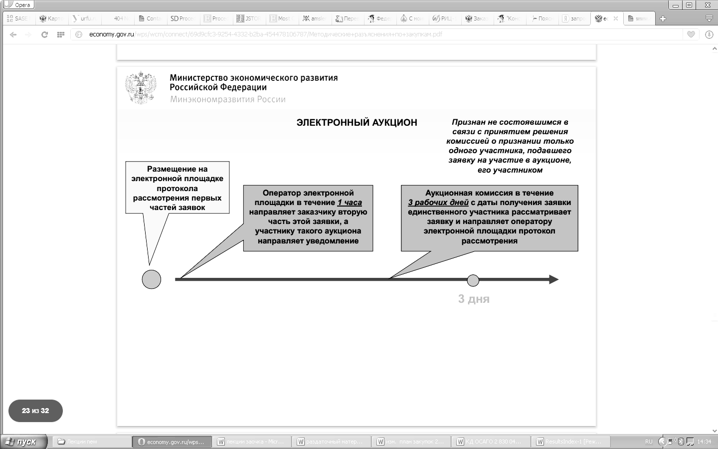 ü Участвовать могут аккредитованные и допущенные к участию ü Электронный аукцион проводится на электронной площадке в указанный в извещении · Время начала проведения аукциона устанавливается оператором в соответствии со временем часовой зоны, в которой расположен заказчик. ü Сначала рассматривается первая часть заявки, после проводиться аукцион ü Электронный аукцион проводится путем снижения НМЦК ü Величина снижения НМЦК (далее - " шаг аукциона") составляет от 0, 5 до 5% НМЦК. ü При проведении электронного аукциона любой его участник также вправе подать предложение о цене контракта независимо от " шага аукциона" · участник не вправе подать предложение о цене контракта, равное ранее поданному этим участником предложению о цене контракта или большее чем оно, а также предложение о цене контракта, равное нулю ü При проведении электронного аукциона устанавливается время приема предложений, составляющее 10 минут от начала проведения такого аукциона до истечения срока подачи предложений о цене контракта, а также 10 минут после поступления последнего предложения о цене контракта. · Если в течение указанного времени ни одного предложения о более низкой цене контракта не поступило, такой аукцион автоматически завершается. ü В течение одного часа после размещения на электронной площадке протокола, оператор электронной площадки обязан направить заказчику протокол и вторые части заявок на участие в таком аукционе, поданных его участниками, предложения о цене контракта которых при ранжировании получили первые 10 порядковых номеров
