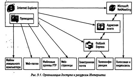 Примером броузера, предназначенного для просмотра Web-документов, может служить Internet Explorer 5.0. Программа предоставляет единый метод доступа к локальным документам компьютера, ресурсам корпоративной сети Intranet и к информации, доступной в Интернете. Она обеспечивает работу с World Wide Web, предоставляет идентичные средства работы с локальными папками компьютера и файловыми архивами FTP, дает доступ к средствам связи через Интернет. Соответствующие программы (Outtook Express и Microsoft NetMeeting) автономны, но рассматриваются как часть пакета Internet Explorer 5.0. Схема использования Интернета через Internet Explorer представлена на рис. 8.1.