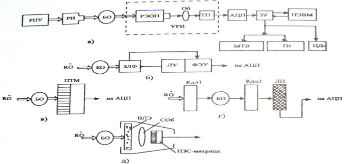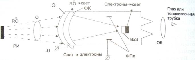 Структурная схема усилителя яркости рентгеновского излучения: РИ - рентгеновский излучатель; О - объект; Э - экран; ФК - фотокатод; ФПл - фокусирующие пластины; ВхЭ - выходной экран; Об – объектив Рентгеновское излучение, прошедшее через об., попадает через стекло вакуумной колбы на экран, преобразующий его в свет. Вплотную к экрану расположен слой фотокатода, из которого под действием света выбиваются электроны. Ускоренные электрическим полем электроны с помощью фокусирующих пластин направляются на выходной экран из катода люминофора, где превращаются в свет, во много раз усиленный по яркости. УРИ позволяют не только усиливать яркость, но и снижать дозы излучения. С появлением цифровых ЗУ и устройств ввода изображений в ПЭВМ началась разработка цифровых приемников рентген. изображений, совмещенных с УРИ - матричные приемники, сочетающие технологию цезий-йодного экрана с матрицей кремниевых фотодиодов (минимальные потери фотонов). Другая разновидность плоских приемников - матрицы тонкопленочных полевых транзисторов, покрытых аморфным селеном (высокое качество изображения, отсутствует многоступенчатый процесс преобразования - рентгеновские кванты преобразуются в потенциальный рельеф зарядов, они -в видеосигнал). В УРИ на рентгеновских электрооптических преобразователях (РЭОП) пять этапов преобразования: 1) рентгеновские кванты экраном преобразуются в световые фотоны; 2) фотоны фотокатодом - в электроны; 3) электроны - в фотоны на выходном экране РЭОП; 4) фотоны - в электроны в ПЗС-матрице; 5) электроны считываются из пикселов ПЗС-матрииы в виде видеосигнала. Использование цифровых приемников позволяет снизить лучевую нагрузку на пациента (время включения рентгеновского луча в таких системах определяется временем захвата кадра изображения цифровыми элементами памяти, что делает эти аппараты практически безопасными), осуществлять математическую обработку, дистанционную передачу снимков, создавать цифровой архив. Экономичность (отсутствие фотолабораторий и дорогих фотопленок и химреактивов). В настоящее время в медицинской практике используется несколько типов конструкций цифровых рентгенодиагност. аппаратов (ЦРА), различающихся, прежде всего, типом детектора. Общие элементы в этих аппаратах - рентген. питающее устройство (РПУ) (с СЧ или ВЧ высоковольтным генератором), рентген. излучатель (РИ) (трубка) и система цифровой обработки электр. сигнала.