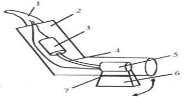 Конструкция механического сканера: 1- кабель; 2- корпус сканера в виде рукоятки; 3- двигатель; 4- гибкий вал; 5- УЗ- преобразователь; 6- УЗ плоскофокусированный луч; 7- акустическое окно Применяются также механические преобразователи с секторным сканированием, внутриполостные (урология, кардиология). При векторном сканировании наблюдают движение отдельных органов. Электронное сканирование (наиболее перспективное) - используются многоэлементные УЗ- преобразователи, представляющие линейку пьезопреобразователей. Каленый элемент линейки используется и для возбуждения, и для приема УЗ-колебаний. На практике применяют последовательное и параллельное возбуждение пьезоэлементов. Регулируя величину задержки реализуют электронное секторное сканирование. С помощью фазовых задержек сигналов управления по группам элементов антенной решетки реализуют электронное фокусирование УЗ-луча. Временные задержки создаются фазирующими устройствами. Фазирующие устройства могут быть построены по последовательной, параллельной и смешанной (удается уменьшить время задержки у параллельных элементов и снизить влияние ошибок задержки у отдельных, последовательно включенных элементов задержки) схемам включения элементов задержки. Наиболее эффективно применять УЗ электроакустические преобразователи, пьезоэлементы у которых последовательно коммутируются электронными ключами. Каждый пьезоэлемент поочередно подсоединяется к генератору. Перемещение УЗ луча в таких устройствах достигается путем последовательного электрического переключения пьезоэлементов матрицы. Чаще всего используются линейные и веерные матрицы пьезоэлементов. Благодаря небольшой массе, малой стоимости и простоте управления элементами матриц сканирующие устройства этого типа считаются наиболее перспективными. Число коммутируемых элементов в них достигает 320 и более. При этом основной проблемой является обеспечение идентичности каждого элемента матрицы.