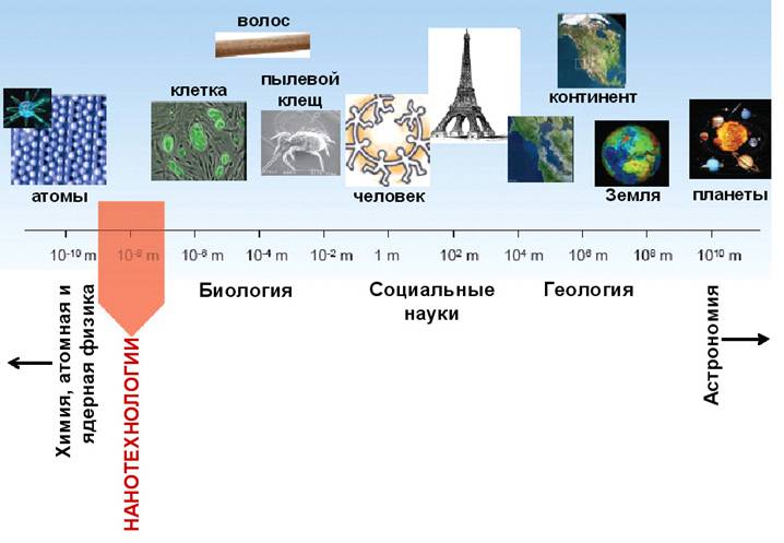 Рисунок 1. Место нанотехнологии среди остальных отраслей знаний на логарифмической шкале размеров.