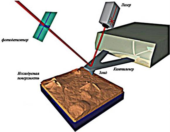 Рисунок 9. Принцип работы сканирующего зондового микроскопа (взято из https://www.nanometer.ru/2007/06/06/atomno_silovaa_mikroskopia_2609.html#). Пунктиром показан ход луча лазера. Остальные объяснения в тексте.