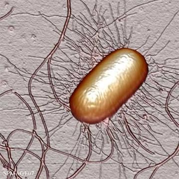 Рисунок 11. Бактерия кишечной палочки (Escherichia coli). Изображение получено с помощью сканирующего зондового микроскопа. Длина бактерии – 1, 9 мкм, ширина – 1 мкм. Толщина жгутиков и ресничек – 30 нм и 20 нм, соответственно. Автор: Ang Li, National University of Singapore. Другая группа сканирующих зондовых микроскопов для построения рельефа поверхности использует так называемый квантово-механический «туннельный эффект». Суть туннельного эффекта состоит в том, что электрический ток между острой металлической иглой и поверхностью, расположенной на расстоянии около 1 нм, начинает зависеть от этого расстояния – чем меньше расстояние, тем больше ток. Если между иглой и поверхностью прикладывать напряжение 10 В, то этот «туннельный» ток может составить от 10 рА до 10 нА. Измеряя этот ток и поддерживая его постоянным, можно сохранять постоянным и расстояние между иглой и поверхностью. Это позволяет строить объёмный профиль поверхности (см. рис. 12). В отличие от атомно-силового микроскопа, сканирующий туннельный микроскоп может изучать только поверхности металлов или полупроводников.