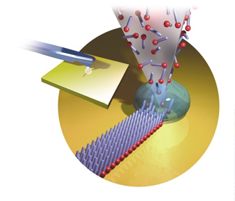 С помощью зондового микроскопа можно не только двигать атомы, но и создавать предпосылки для их самоорганизации. Например, если на металлической пластине находится капля воды, содержащая ионы тиолов, то зонд микроскопа будет способствовать такой ориентации этих молекул, при которой их два углеводородных хвоста будут обращены от пластины. В результате, можно выстроить монослой тиольных молекул, прилипших к металлической пластине (см. рис. 14). Этот способ создания монослоя молекул на поверхности металла называют «перьевой нанолитографией».
