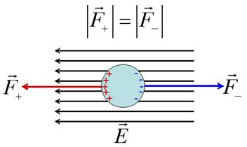 Рисунок 18. Схематическое изображение шарообразной частицы, находящейся в ОДНОРОДНОМ электрическом поле напряжённостью Е. Знаками " +" и " -" показаны связанные заряды, возникшие на поверхности частицы при её поляризации. Электрические силы, действующие на положительные (F+) и отрицательные (F-) связанные заряды, одинаковы.